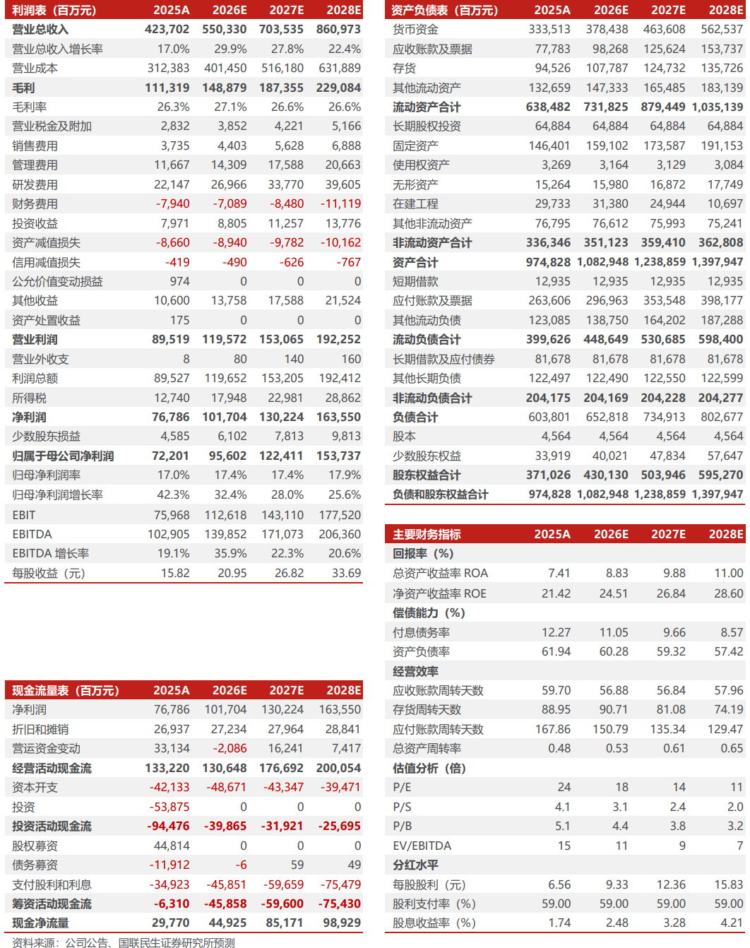 ■ 事件:2026年3月9日,公司发布2025年度报告。2025年全年,公司实现营业收入4237.02亿元,同比增长17.04%;归属于上市公司股东的净利润722.01亿元,同比增长42.28%;扣除非经常性损益的净利润645.08亿元,同比增长43.37%。其中,Q4单季度实现营业收入1406.30亿元,归母净利润231.67亿元,业绩再超预期,盈利能力持续行业领先。